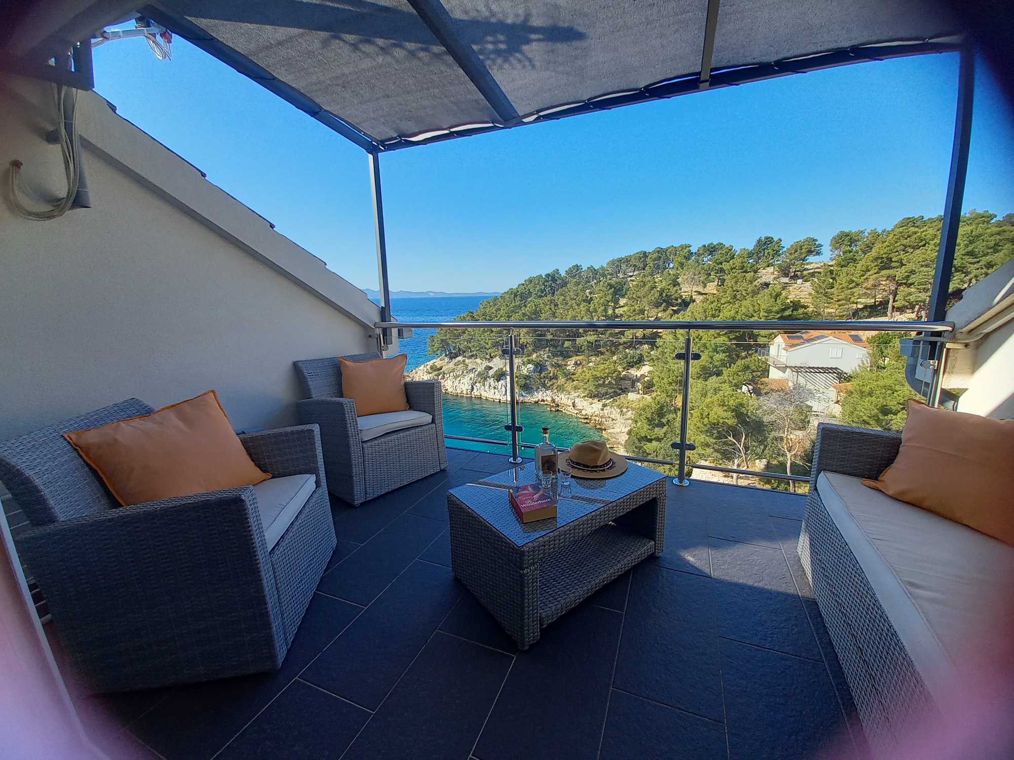 Apartment 1 - with 35 m2 terrace with panoramic view on blue sea and island Hvar, 2 bathrooms each with shower/WC, open plan kitchen. 3 separate bedrooms with twin beds. It's suitable for 6 persons.
